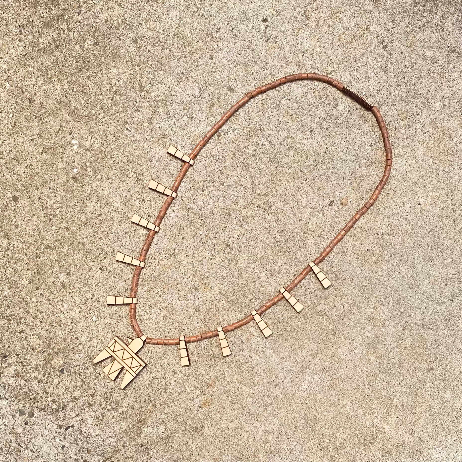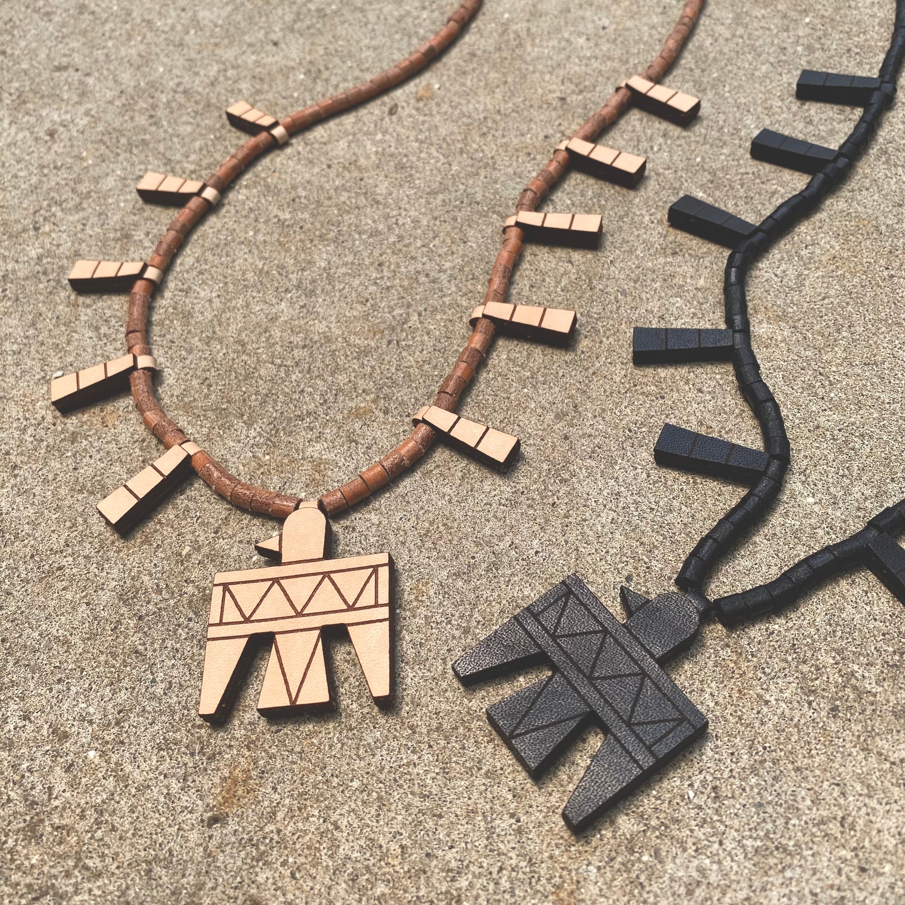 1920年代、ニューメキシコ州サントドミンゴに住む先住民族が生み出したバッテリーバードをモチーフにしたレザーネックレス。